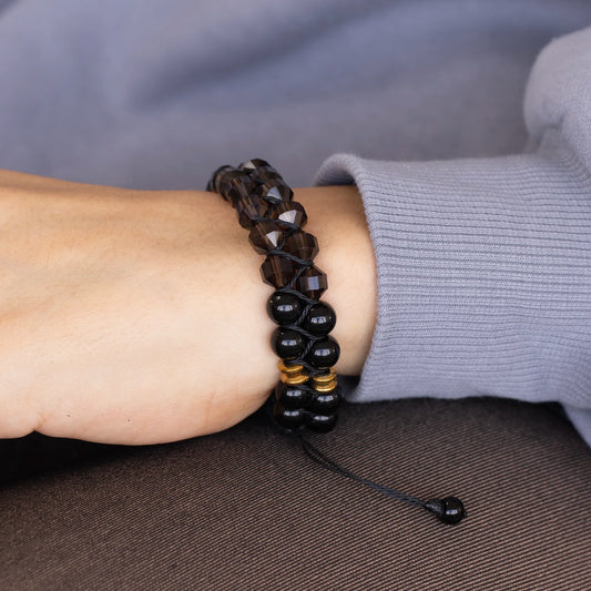 Natural Smoky Quartz & Black Onyx Beaded Double Row Macrame Bracelet