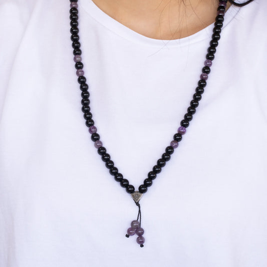 Natural Amethyst & Black Onyx Beaded 108 Mala & Rosary Necklace