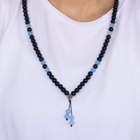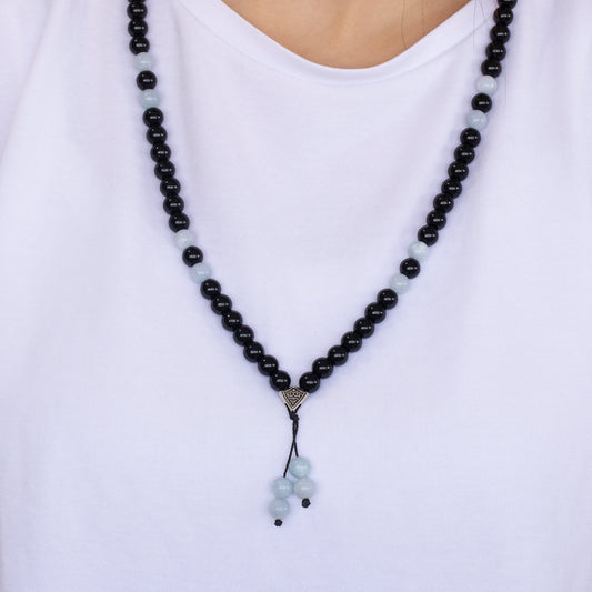 Natural Aquamarine & Black Onyx Beaded 108 Mala & Rosary Necklace