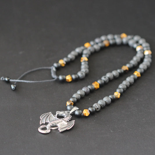 Stainless Steel Dragon Pendant, Natural Tiger Eye & Black Onyx & Lava Stone Beaded Macrame Necklace