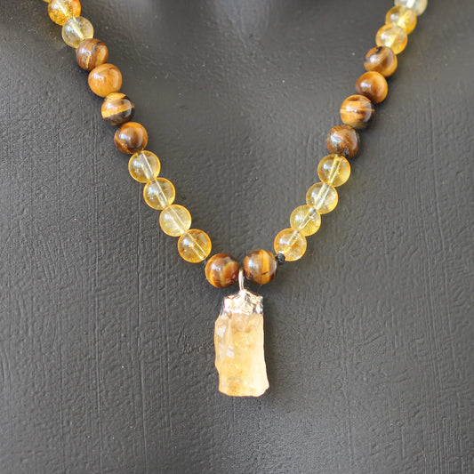 Natural Raw Citrine Crystal Pendant, Citrine & Tiger Eye Beaded Macrame Necklace