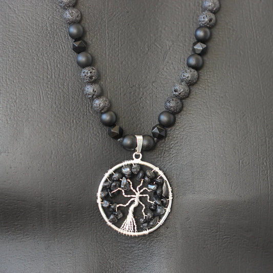 Natural Black Onyx Tree Of Life Pendant, Black Onyx & Lava Stone Beaded Macrame Necklace