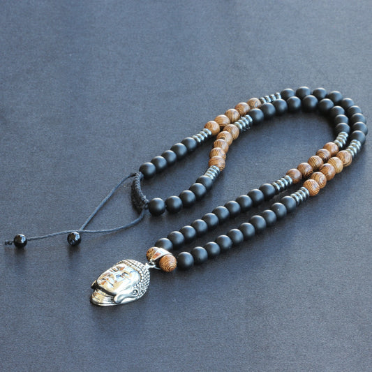 Stainless Steel Buddha Pendant, Natural Sandalwood & Black Onyx Beaded Macrame Necklace