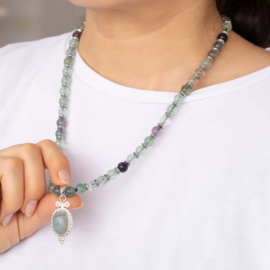 Natural Fluorite Silver Pendant, Natural Fluorite Beaded Clasp Necklace