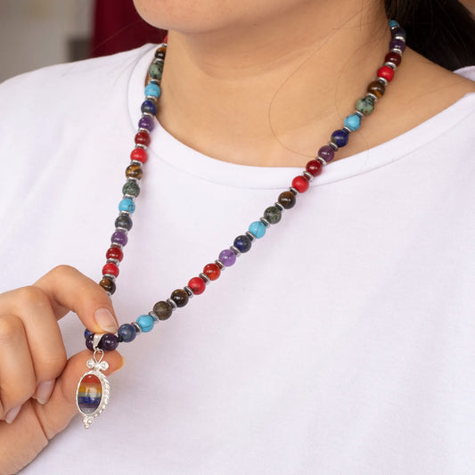 Natural 7 Chakra Silver Pendant, Natural 7 Chakra Beaded Clasp Necklace
