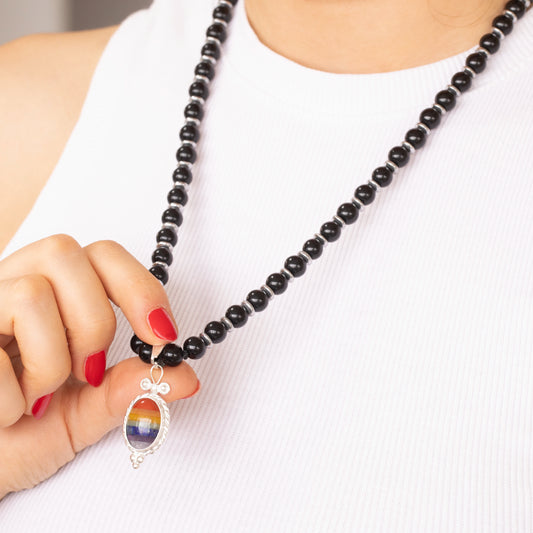 Natural 7 Chakra Silver Pendant, Natural Black Onyx Beaded Clasp Necklace