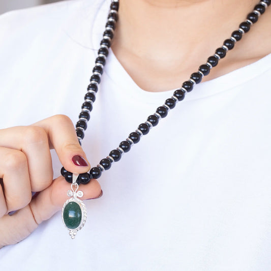 Natural Nephrite Jade Silver Pendant, Natural Black Onyx Beaded Clasp Necklace