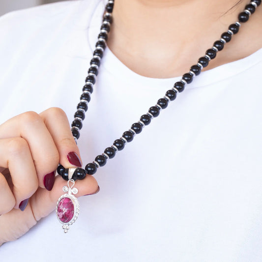 Natural Pink Imperial Jasper Silver Pendant, Natural Black Onyx Beaded Clasp Necklace