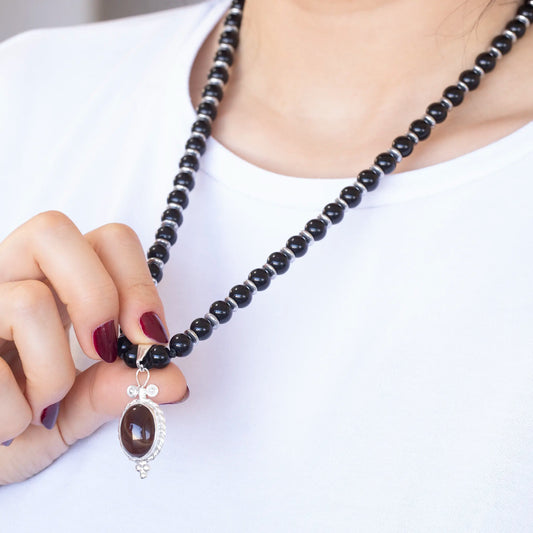 Natural Brown Agate Silver Pendant, Natural Black Onyx Beaded Clasp Necklace