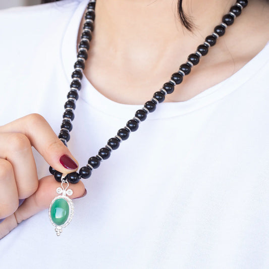 Natural Green Agate Silver Pendant, Natural Black Onyx Beaded Clasp Necklace