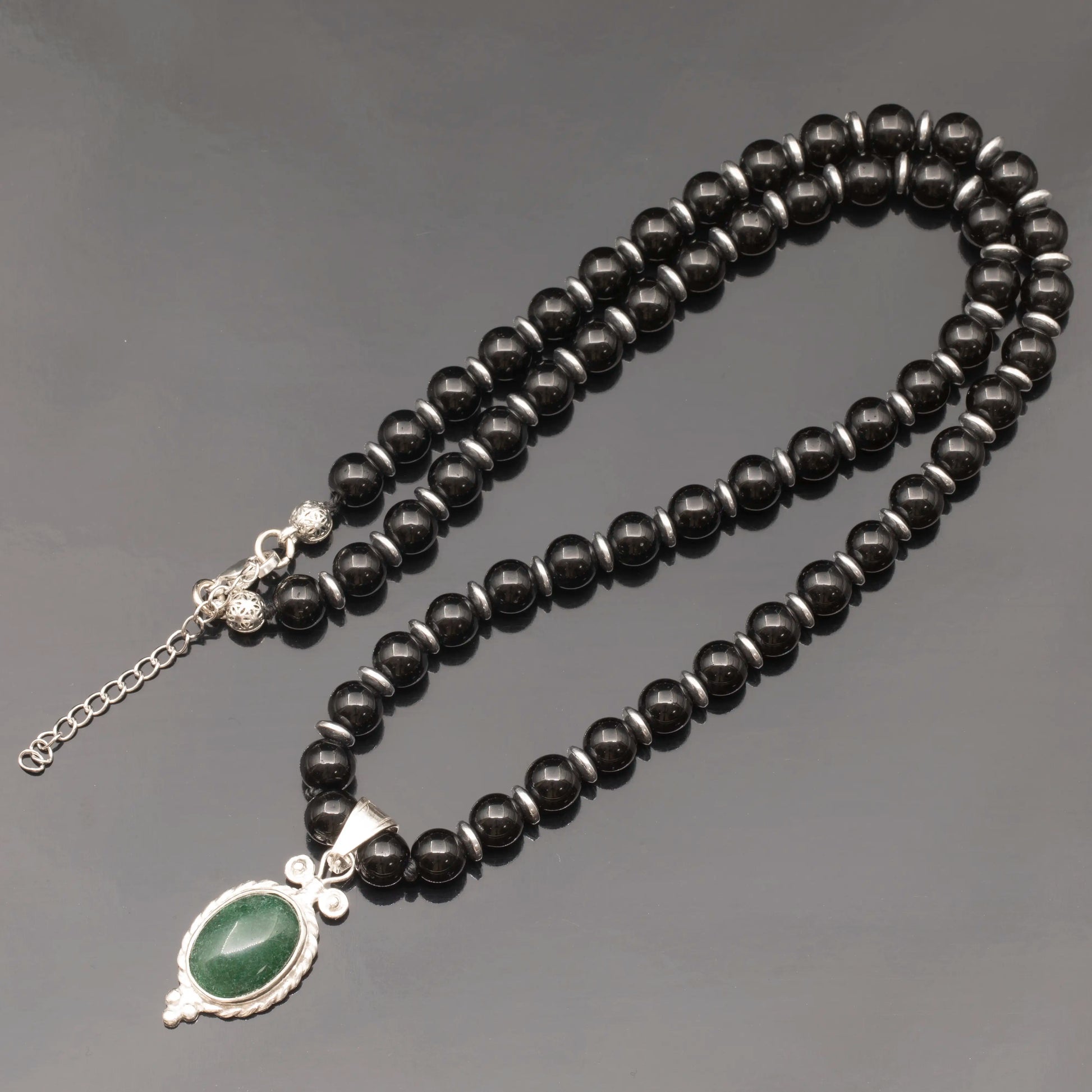 Natural Nephrite Jade Silver Pendant, Natural Black Onyx Beaded Clasp Necklace