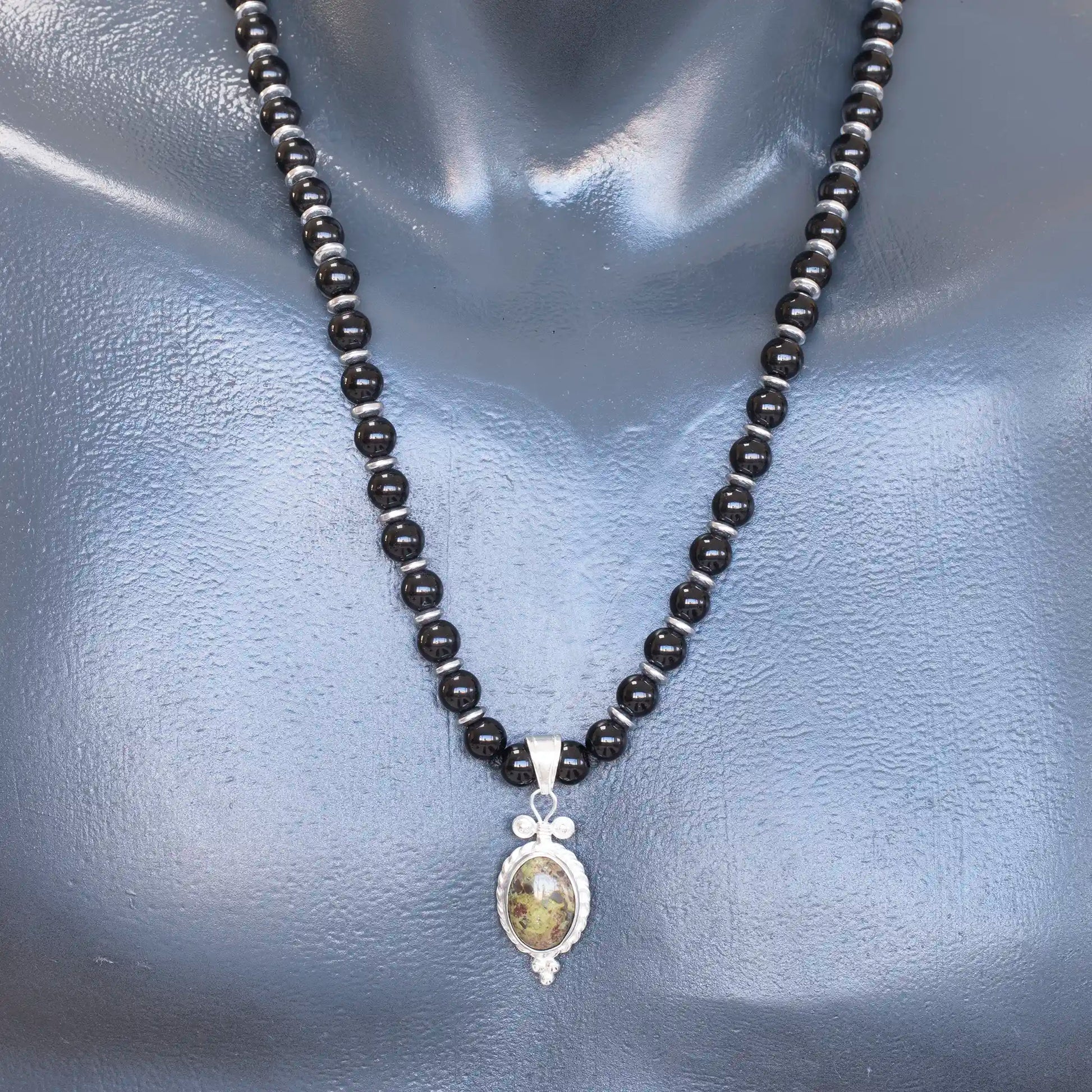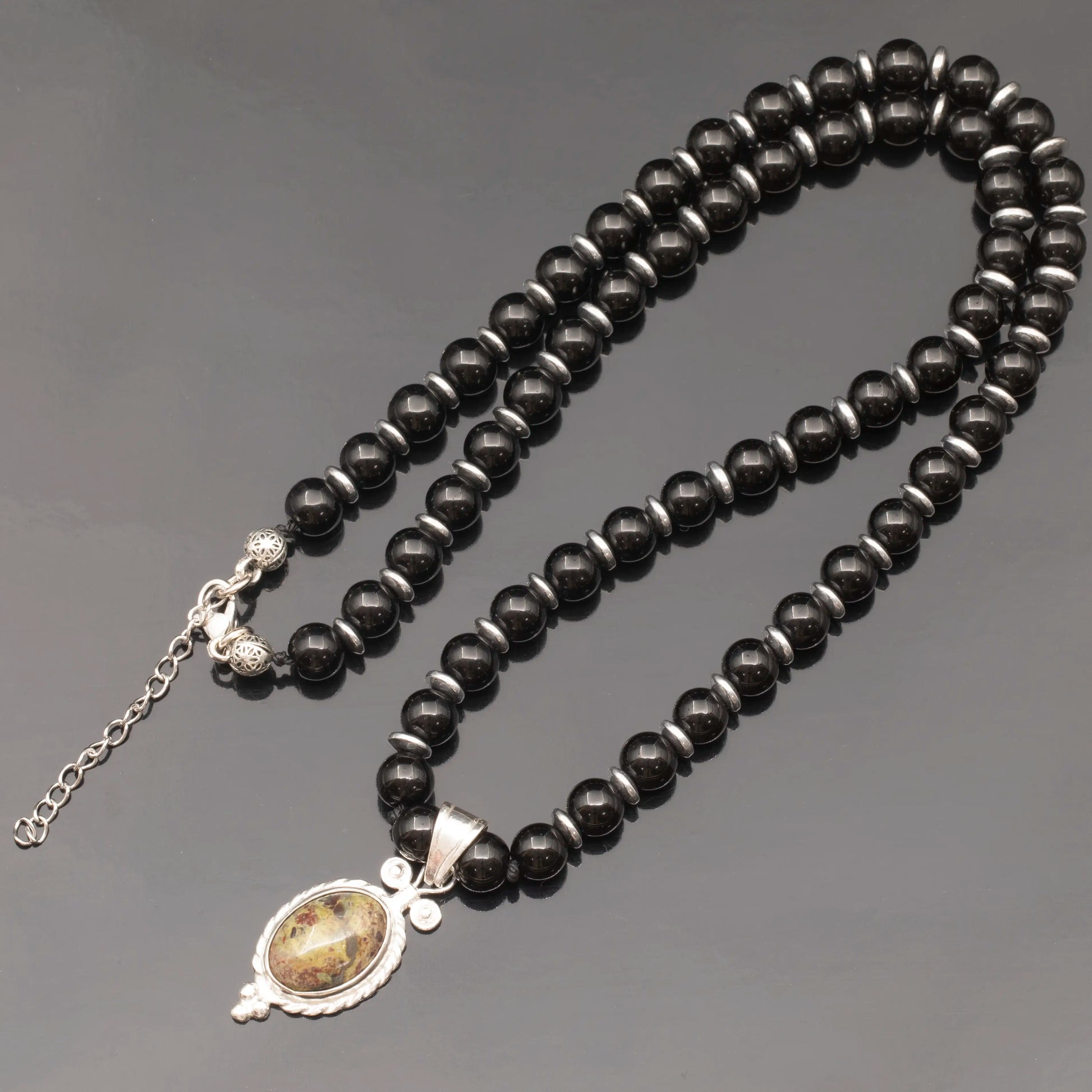Natural Bloodstone Silver Pendant, Natural Black Onyx Beaded Clasp Necklace