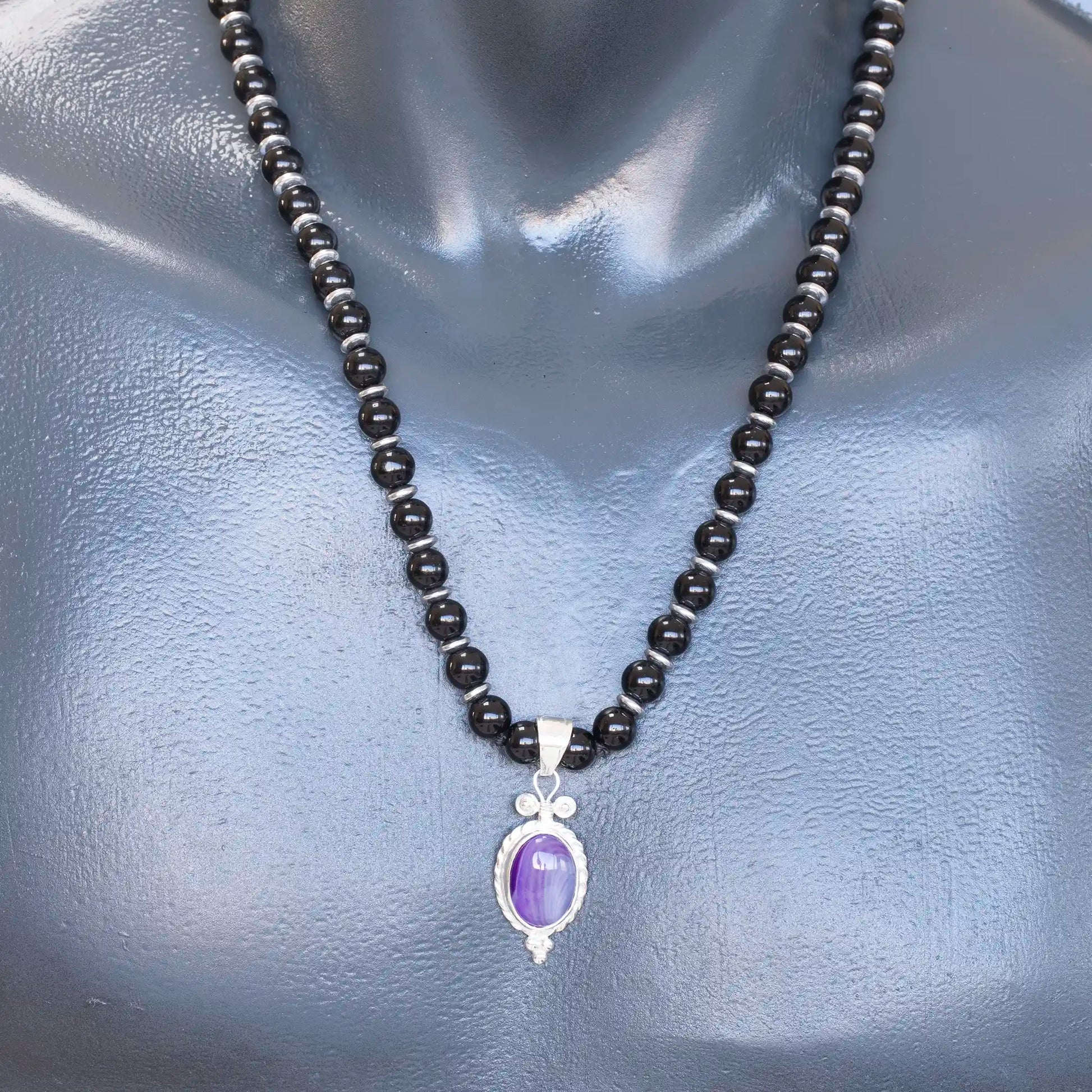 Natural Purple Agate Silver Pendant, Natural Black Onyx Beaded Clasp Necklace