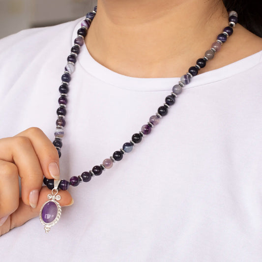 Natural Purple Agate Silver Pendant, Natural Purple Agate Beaded Clasp Necklace