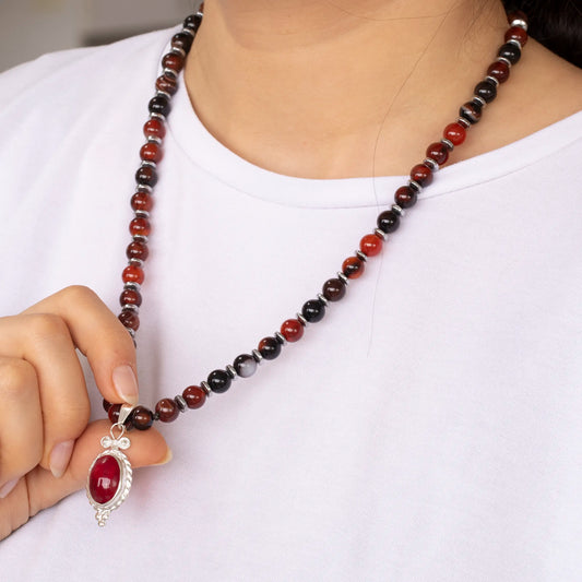Natural Red Tiger Eye Silver Pendant, Natural Red Tiger Eye Beaded Clasp Necklace