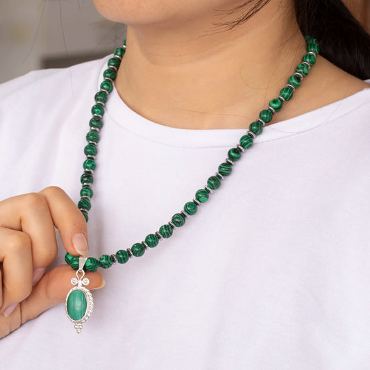 Natural Malachite Silver Pendant, Malachite Beaded Clasp Necklace