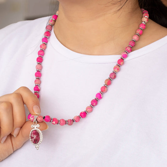 Natural Pink Imperial Jasper Silver Pendant, Natural Pink Imperial Jasper Beaded Clasp Necklace