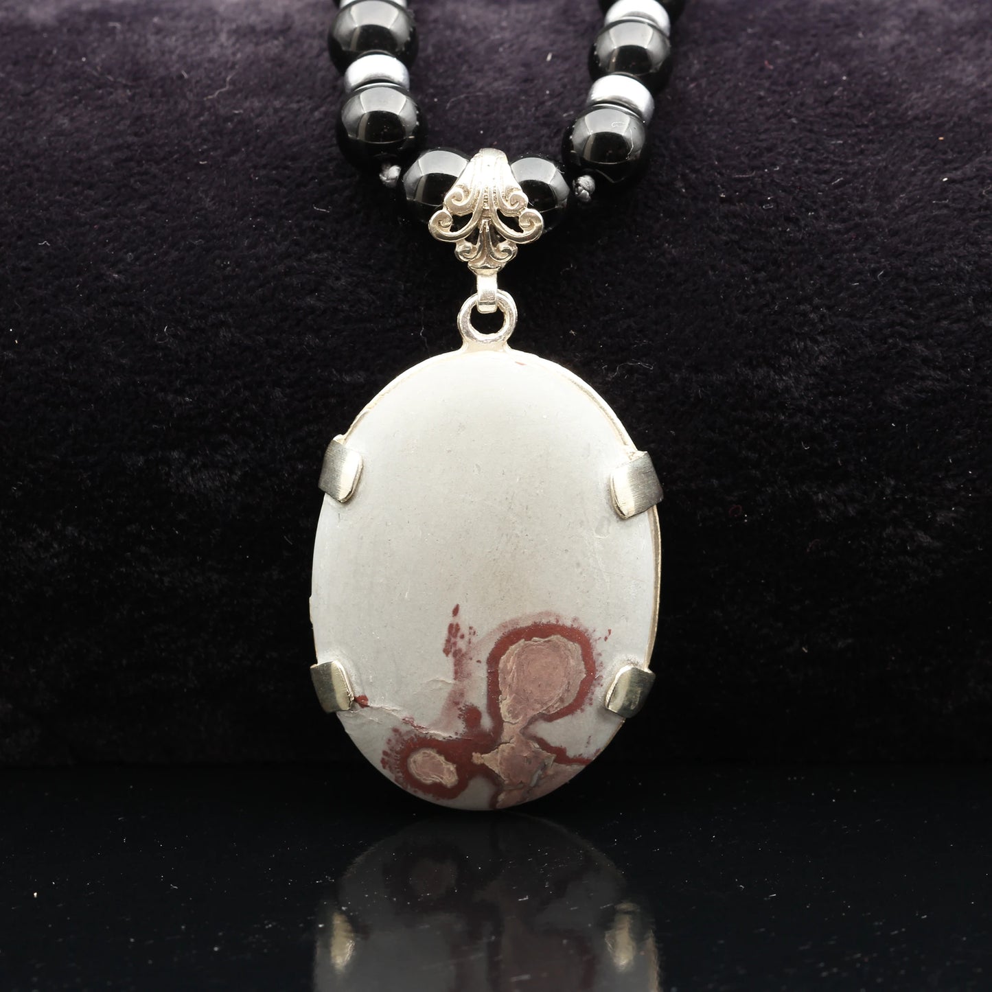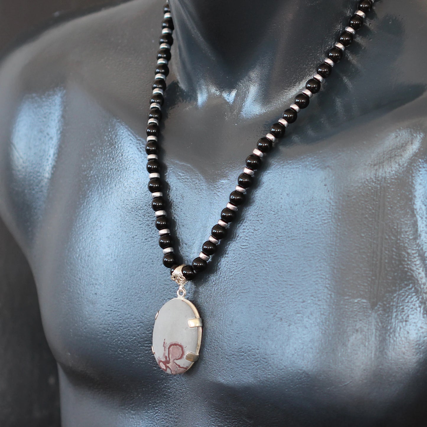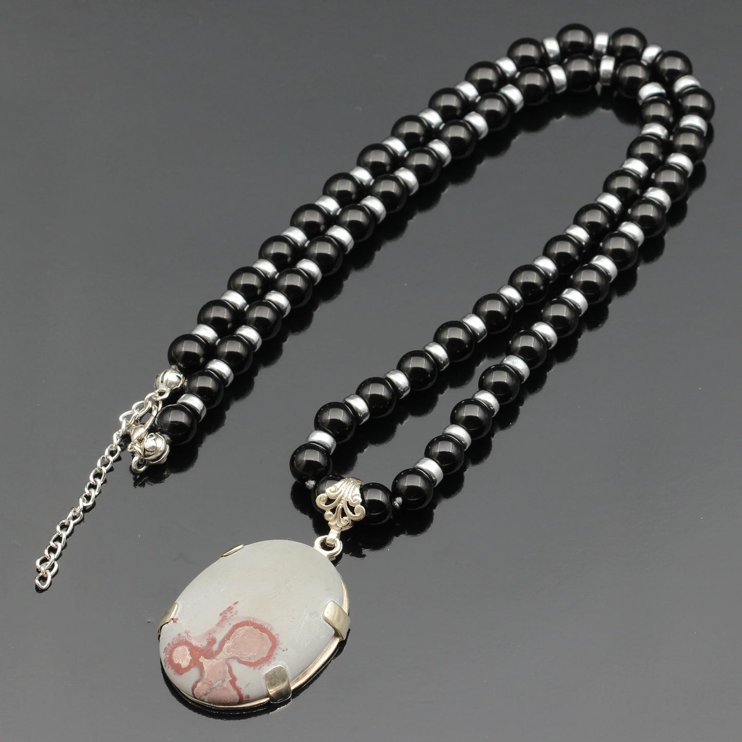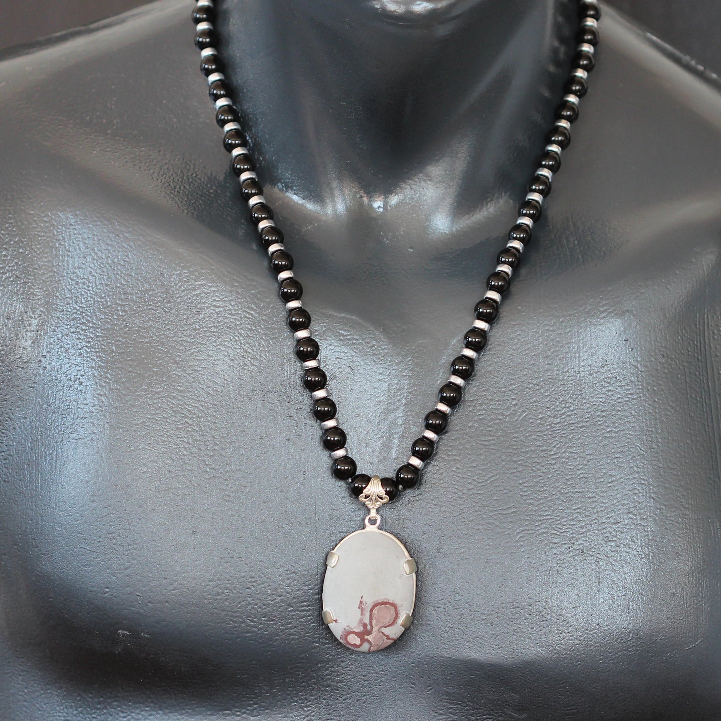 Natural Dendritic Jasper Silver Pendant, Natural Black Onyx Beaded Clasp Necklace