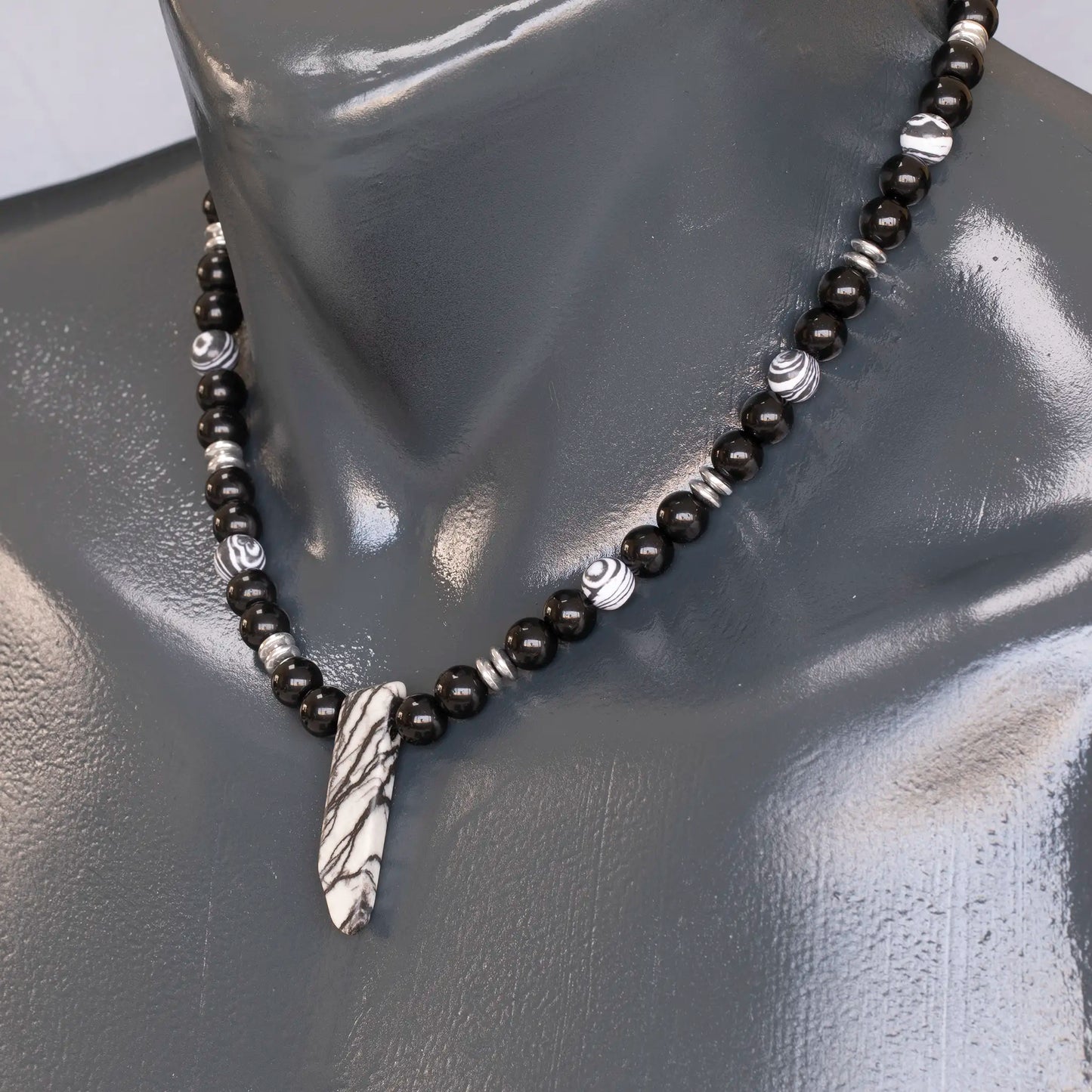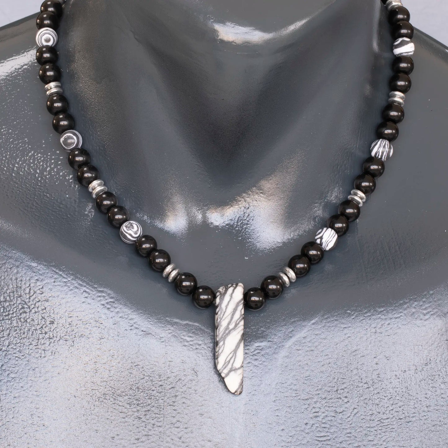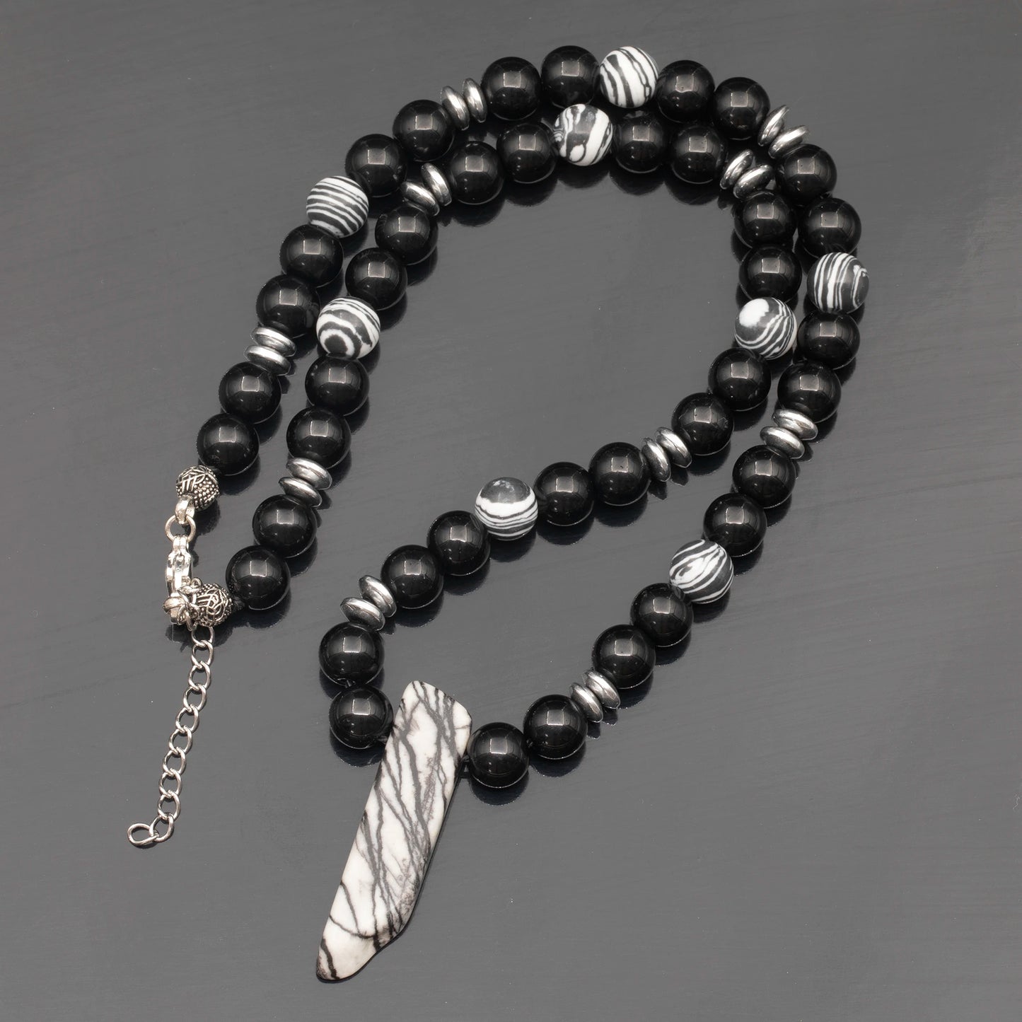 Natural Zebra Jasper Sliced Pendant, Natural Black Fordite & Black Onyx Beaded Necklace